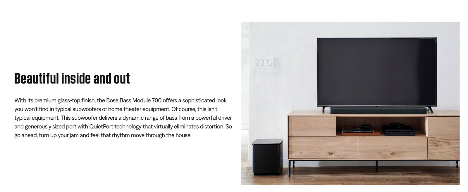 Thunderous bass, wireless connectivity. The Bose Bass Module 700 is the best wireless bass module we’ve ever designed for our home theater systems. This subwoofer offers a sophisticated look and delivers a dynamic range of bass. Plus, the generously sized port virtually eliminates distortion.