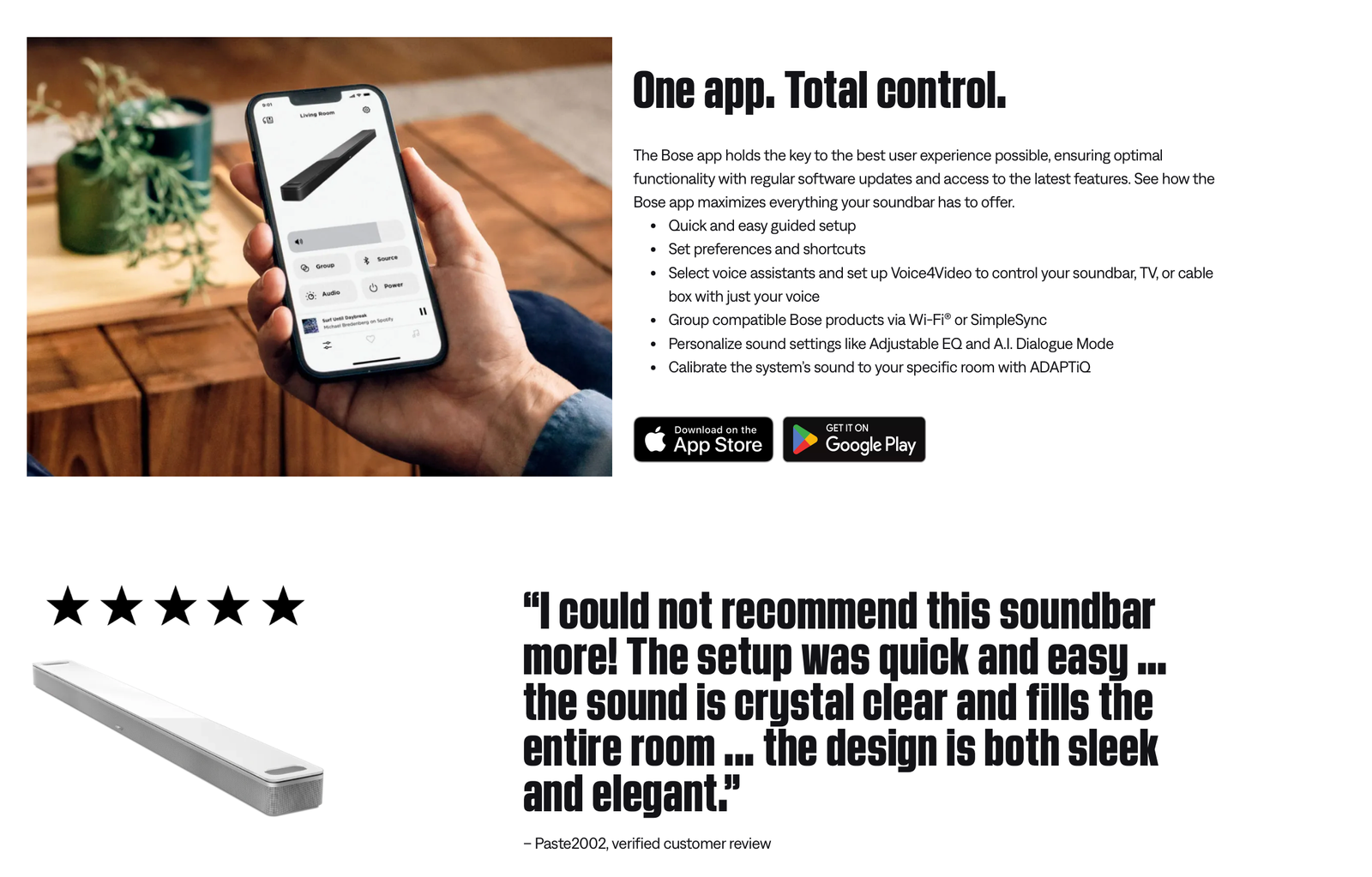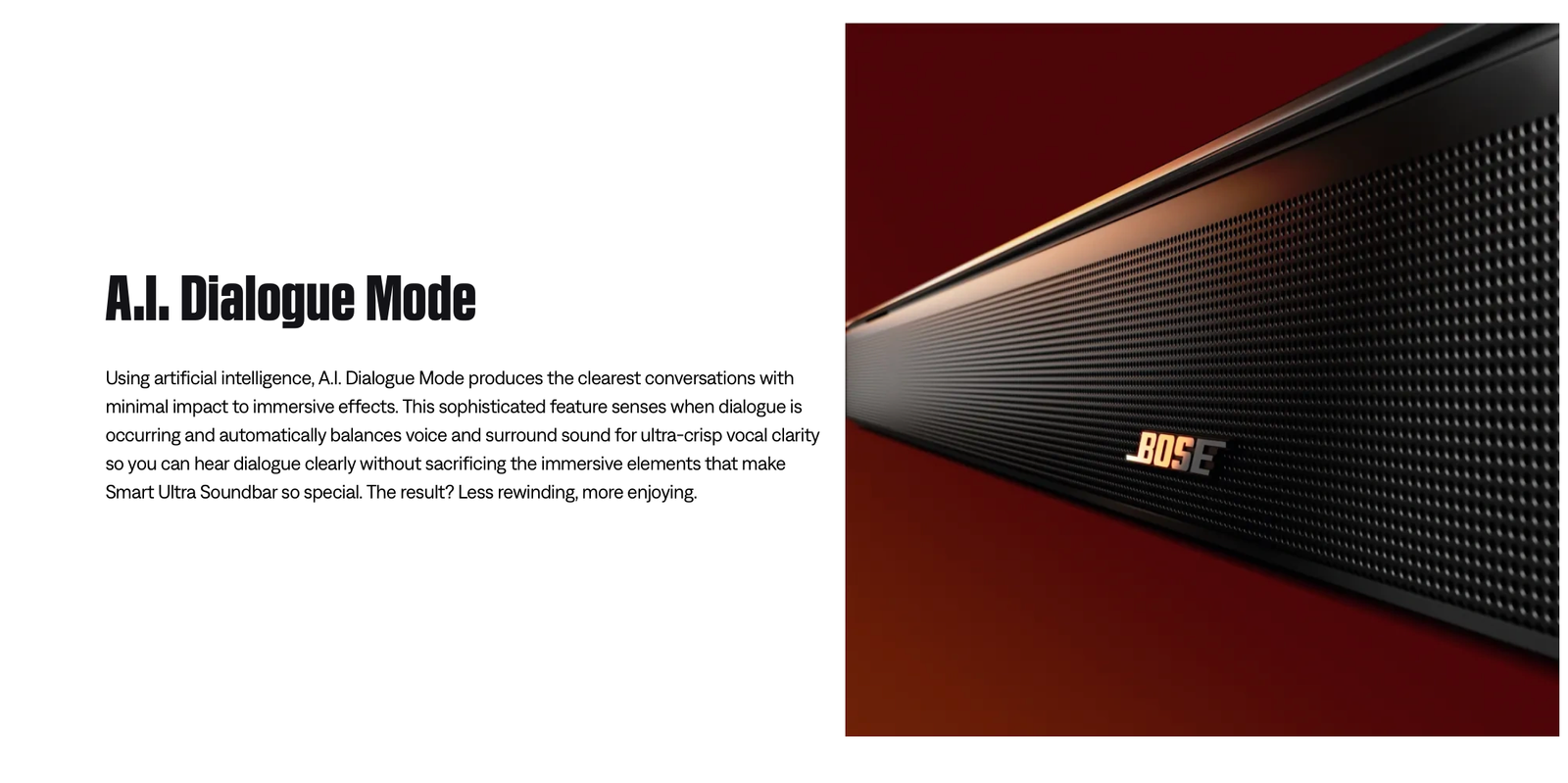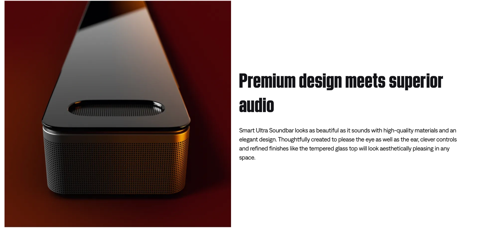 Designed with movie buffs and music lovers in mind, our top-of-the-line soundbar combines Dolby Atmos® and Bose TrueSpace technology for a fully immersive experience that goes beyond watching. Smart Ultra Soundbar’s nine total speakers — including two upward-firing — deliver our best spatialized audio and soundbar performance for cinematic movie nights from the comfort of your living room. Packed with cutting-edge features like A.I. Dialogue Mode for ultra-crisp vocal clarity and ADAPTiQ audio room calibration, Smart Ultra Soundbar will take you deep into the heart of all your favorite content. You’ve never heard it like this before.