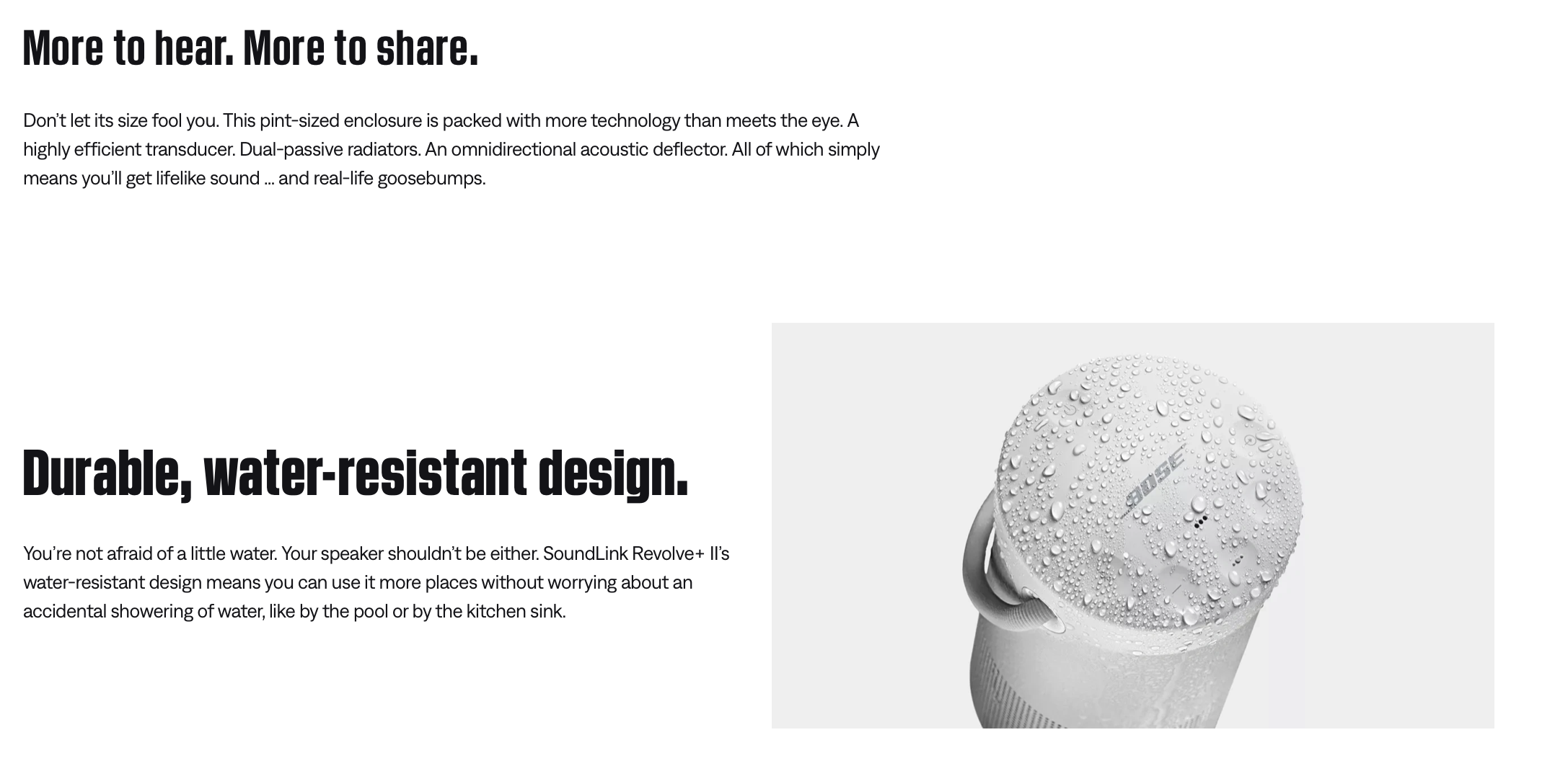 Experience the full 360° with the SoundLink Revolve+ II — one of our best-performing portable Bluetooth speakers. It was engineered to spread deep, jaw-dropping sound in every direction, so when everyone stands around it, everyone gets the same experience. If you set it near a wall, sound will radiate and reflect around the room, immersing you in that same feeling you felt at your favorite concert. And with a flexible handle, it’s designed to go wherever you want to bring the music.