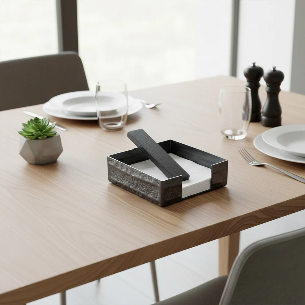 Enhance your dining table with this elegant square tissue holder designed for both style and functionality. Crafted from high-quality metal with a smooth wooden handle, it offers durability and easy handling for everyday use. Perfect for homes, offices, and special occasions, this modern tissue holder adds a refined touch to any space.