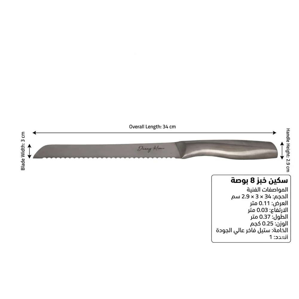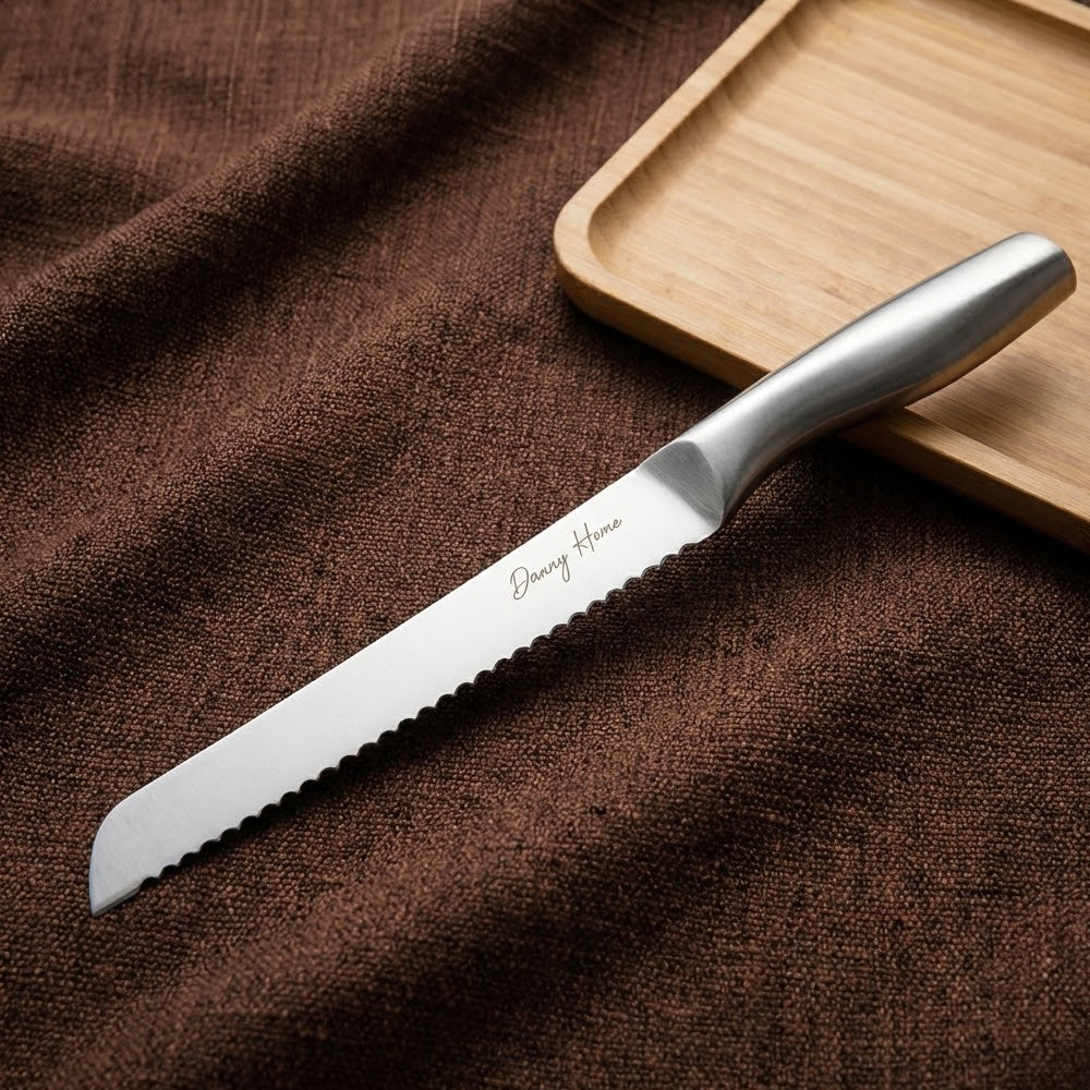 Experience effortless slicing with this stainless steel bread knife designed for precision, durability, and everyday kitchen use. Its ultra-sharp blade easily cuts through bread, fruits, and vegetables with clean, smooth results. Featuring a one-piece seamless design and an ergonomic handle, it ensures safety, comfort, and easy control during use.
