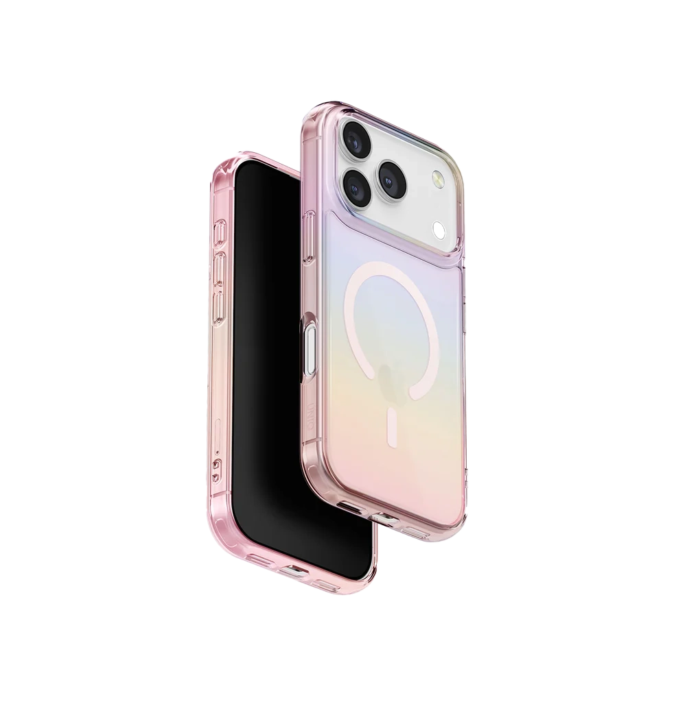 UNIQ Iridescia Hybrid iPhone 17 Pro case – holographic shimmer, MagClick™ charging, stylish protection, and flawless wireless compatibility.
