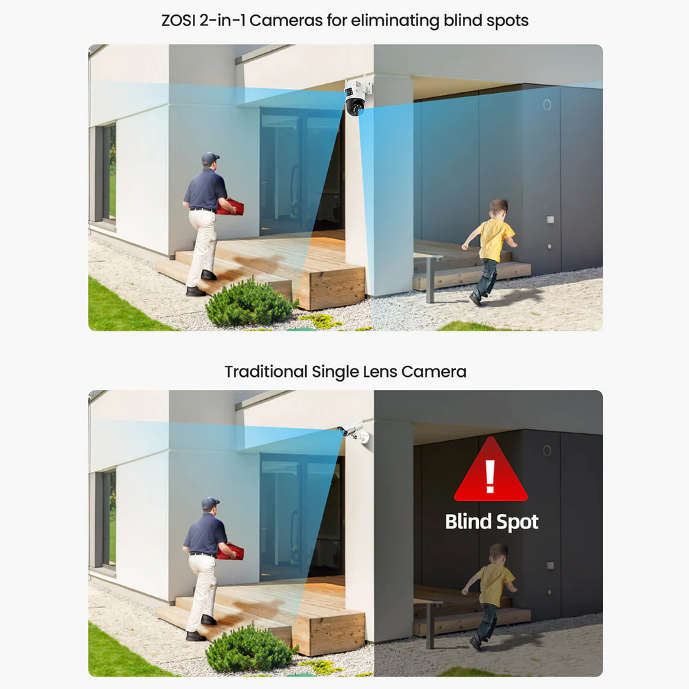 Upgrade your security system with the ZOSI C298 Dual Lens PT Camera, designed to provide both wide-area monitoring and detailed close-up views at the same time. With dual lenses, auto tracking, and 8X hybrid zoom, this smart camera delivers enhanced coverage and precise monitoring for homes, offices, and outdoor spaces.